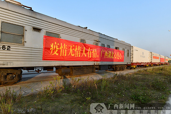 广西新闻网南宁1月30日讯(记者 宋瑶 冼妍杏 黎莹莹)1月30日17时45分,装载着200多吨优质蔬菜、禽蛋的广西捐赠湖北果蔬冷链首发专列从南宁国际铁路港发车,列车疾速运行35个小时后将到达湖北省武汉市。